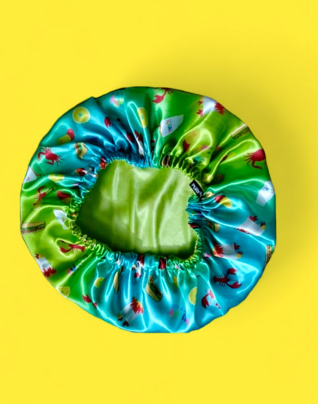 Introducing our Seafood Boil Bonnet, drawing inspiration from the vibrant culture of New Orleans. Indulge in a feast of crawfish, daiquiris, corn, potatoes, and poboys, perfect for lakeside enjoyment. Elevate your dining experience with our satin bonnet, ensuring you dine in both comfort and style. Ideal for a secure fit, these bonnets stay in place all night without budging.